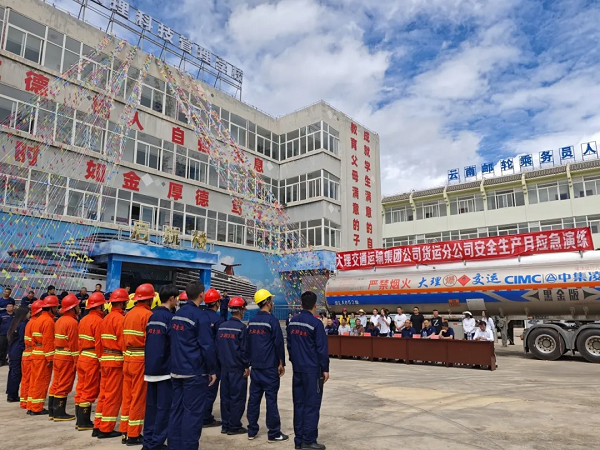 6月20日,金潮物流公司開展了危貨運(yùn)輸險(xiǎn)情演練。演練模擬了危險(xiǎn)品運(yùn)輸駕駛員和押運(yùn)員在完成運(yùn)輸任務(wù)返程途中,因天氣氣溫過高,車輛頂部油氣回收管膠管連接處發(fā)生爆裂泄漏,導(dǎo)致油分子自燃,罐頂處著火的突發(fā)緊急情況。