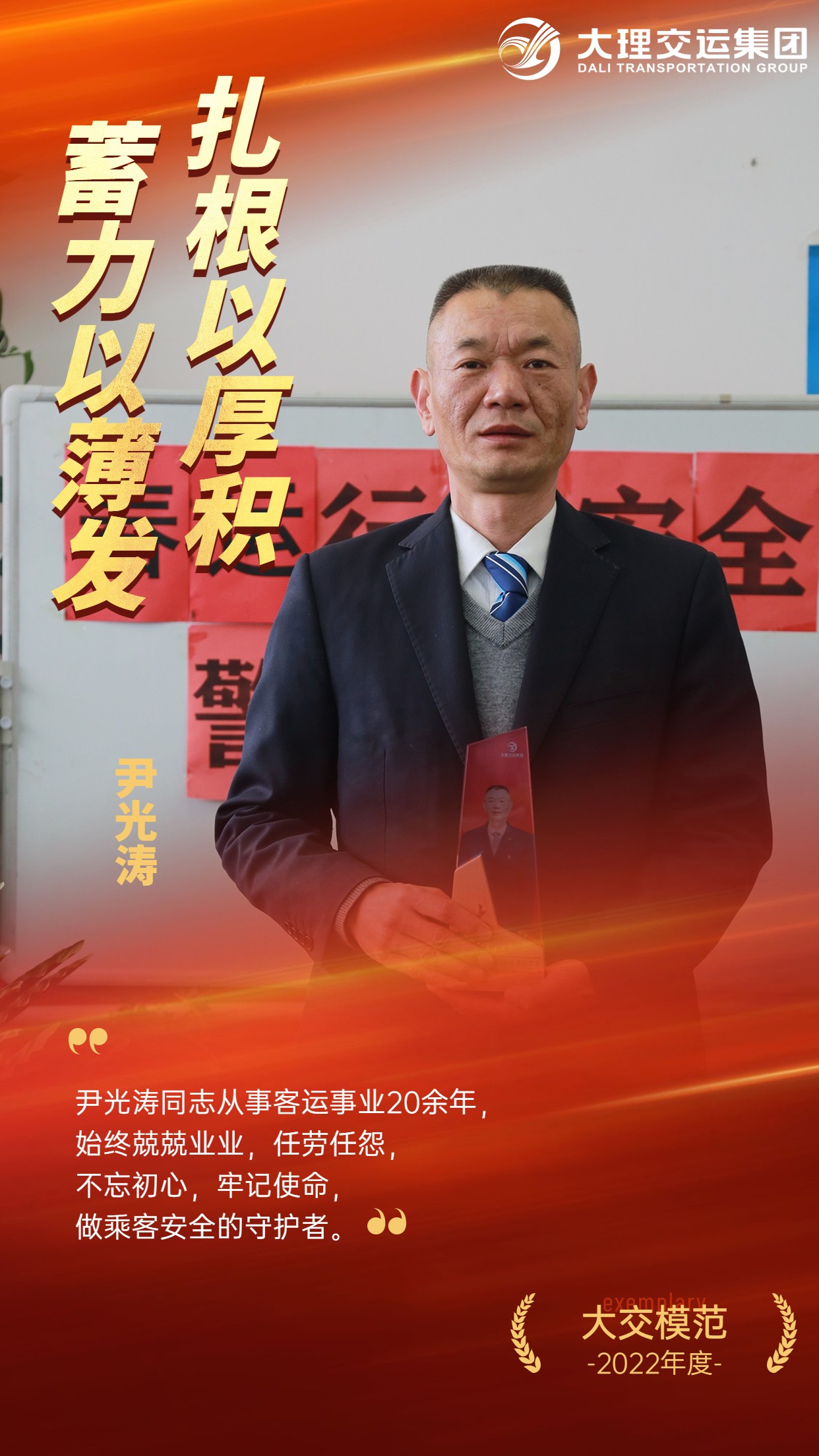 尹光濤,中共黨員,北部客運(yùn)事業(yè)部車輛管科經(jīng)理。參加工作二十年來,尹光濤同志以飽滿的熱情投身到工作中去,兢兢業(yè)業(yè),任勞任怨,先后榮獲集團(tuán)公司“大交模范”、“先進(jìn)生產(chǎn)工作者”、“優(yōu)秀共產(chǎn)黨員”、“業(yè)務(wù)能手”、“安全生產(chǎn)先進(jìn)個(gè)人”等榮譽(yù)。他始終以嚴(yán)謹(jǐn)自律的工作原則和方法,積極參與集團(tuán)公司事業(yè)部的各項(xiàng)改革當(dāng)中,獻(xiàn)言獻(xiàn)策、團(tuán)結(jié)干事、認(rèn)真負(fù)責(zé),為集團(tuán)公司客運(yùn)事業(yè)提質(zhì)升級做出了積極貢獻(xiàn)。